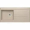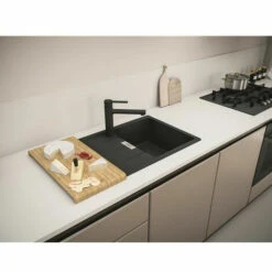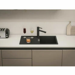 Evier à encastrer Centro Fragranit+ CNG 611-XL Franke 913850. 1 cuve à fleur de plan ou à encastrer : le Fragranit+ est composé à 80% de sable de silice et de 20% de résine composite. Cela le transforme en un matériau particulièrement polyvalent et gratifiant : il permet de réaliser à la fois des coins et bordures impressionnants et de détails fonctionnelles et optiques ravissantes. Fragranit+ le quatrième matériau le plus dur après le diamant, le rubis et le topaze. Il est résistant contre les fissures et l’abrasion et insensible aux acides utilisés dans la cuisine, aux rayures, au froid et à la chaleur inférieur à 280 °. Sa finition lisse procure au matériau un toucher agréable et se nettoie aisément. Vidage Gain de place comprenant bonde manuelle Ø 90 inox et siphon.