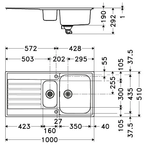 Dimensions : 1004 x 514 mm Découpe : 995 x 506 (R20) mm Bassins : 340 x 400 x 190 / 165 x 306 x 130 mm Caisson : 600 mm