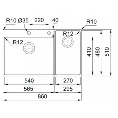 – Rayons de 12 mm dans les angles de la cuve