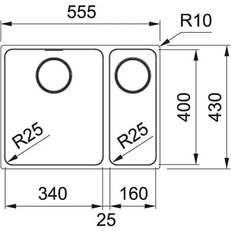 Rayons 25mm en haut et 10mm en bas dans les angles de la cuve