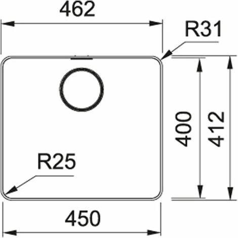 Rayons 25mm en haut et 10mm en bas dans les angles de la cuve