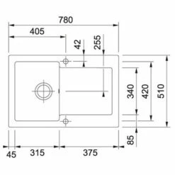 Dimensions : 780 x 510 mm. Découpe : 760 x 490 mm. Bassin : 315 x 420 x 200 mm.