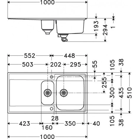 Dimensions : 1000 x 510 mm Découpe : 987 x 497 mm Bassins : 350 x 435 x 175 / 160 x 300 x 120 mm Caisson : 600 mm Gabarit de découpe : non A encastrer ou affleurer
